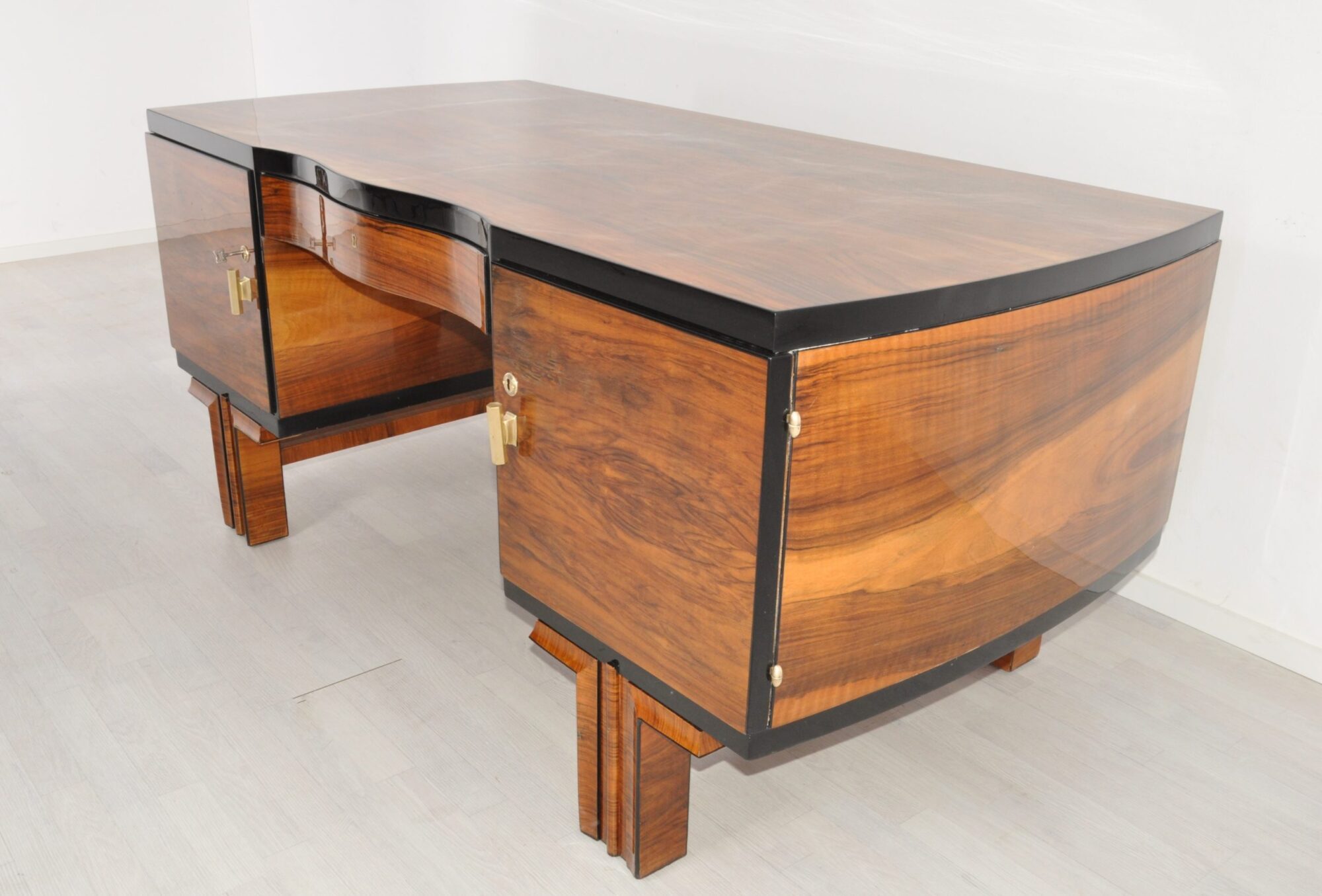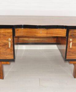 Wundervoller Art Deco Schreibtisch aus den 1920er Jahren. Gefertigt in Frankreich aus edlem Nussbaumholz und in aufwendiger Handarbeit restauriert in unserer Werkstatt in Senden, NRW. Verfeinert mit Klavierlackdetails ist dieser detailreiche Schreibtisch ein echter Hingucker in jedem Wohnzimmer oder Büro. Ein luxuriöses Möbel mit feinen Art Deco Details und toller Verarbeitungsqualität. Das Hochglanz-Finish ist handpoliert und in einem perfekten Zustand. Das Innenleben bietet Stauraum in vier Schubkästen und auf einem Einlegeboden. Bei Fragen stehen wir gerne zur Verfügung.