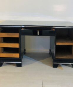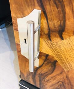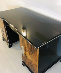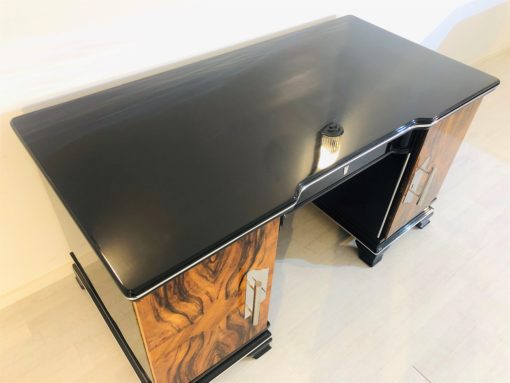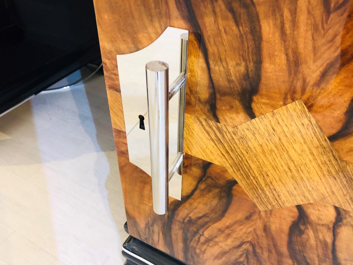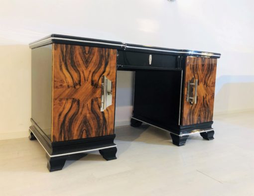 Original 1920er Jahre Art Deco Schreibtisch mit einer wundervollen Walnuss-Wurzelholz-Front. Dieses Meisterstück überzeugt mit seinem schönen, hellbraunen und einzigartig gemaserten Wurzelholz-Türen, sowie den großen Chromgriffen auf den Fronten. A absolut einzigartiges Möbelstück asu Frankreich für Ihr Wohnzimmer oder ein luxuriöses Büro.Restauriert in Perfektion durch unser Schreinerteam mit einem neuen Hochglanz-Finish und tollem Klavierlack. Das Inneleben, mit einem Standard-Layout, bietet Stauraum in drei Schubladen und auf einem Einlegeboden hinter der rechten Tür. Ein verfeinertes Art Deco Möbel in seiner schönsten Form.