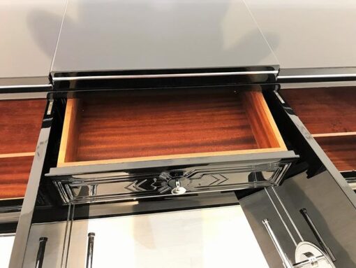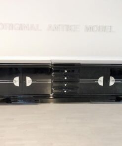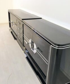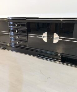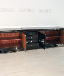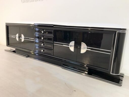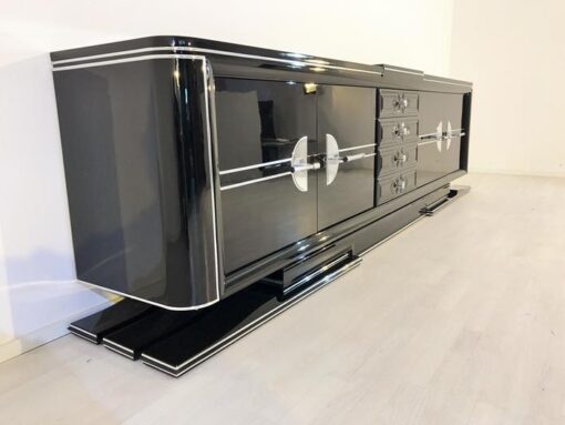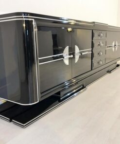 Großartiges Art Deco XXL Sideboard. Exklusives Möbelstück aus Massivholz, Hochglanz-Lack und Chromapplikationen. Dieses Einzelstück überzeugt mit seinem einzigartigen französischen Schnurrbartfuß und dem typischen Art Deco Design. Die klare Formensprache wird hier ergänzt durch wundervolle, große Griffe und tolle Chrombänder. Dieses Meisterstück wurde in Handarbeit gefertigt und ist in einem perfekten Zustand. Bei Fragen sprechen Sie uns an!