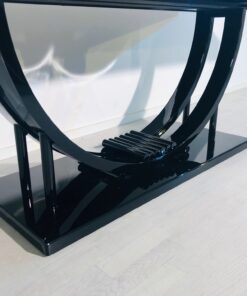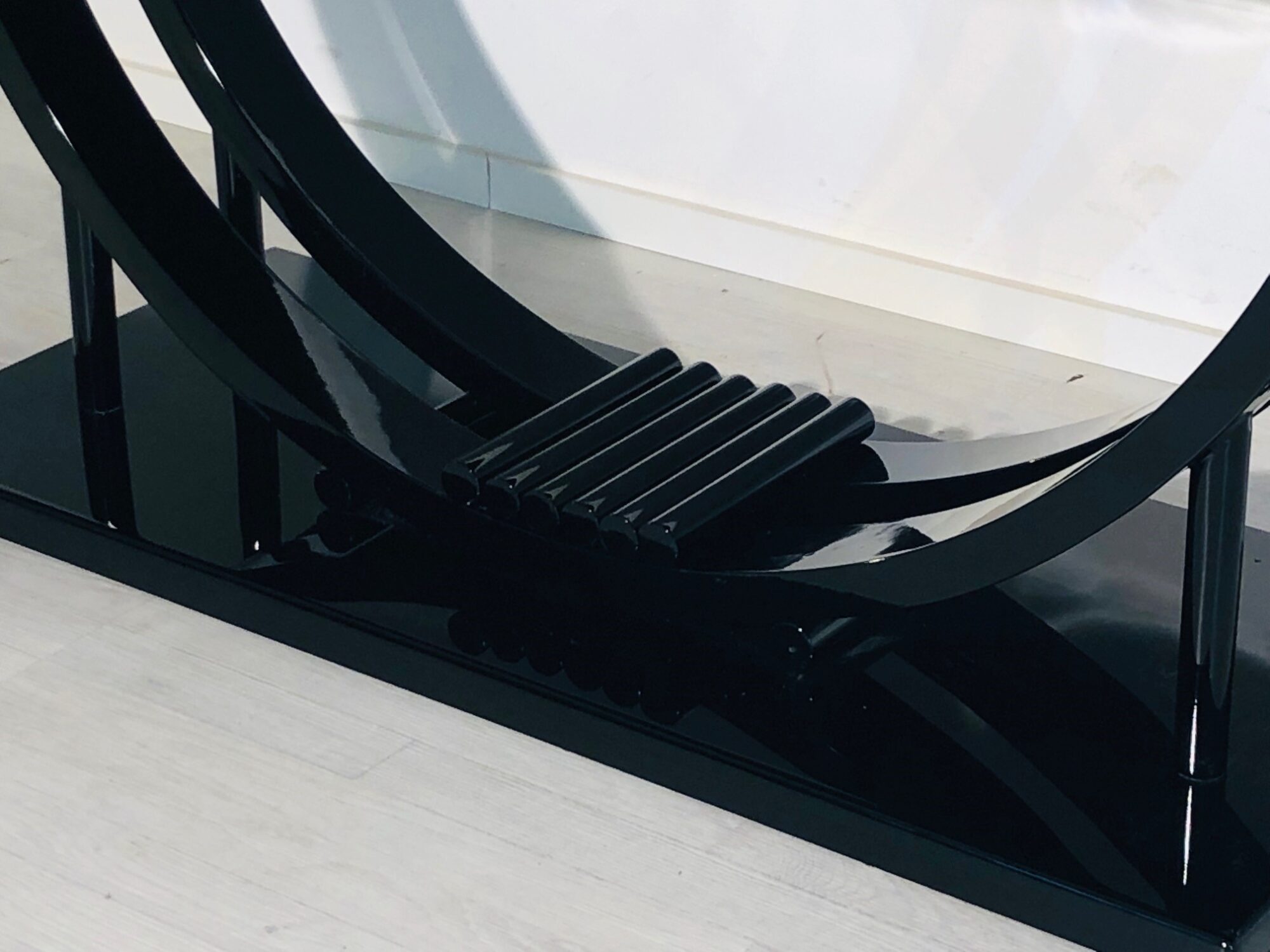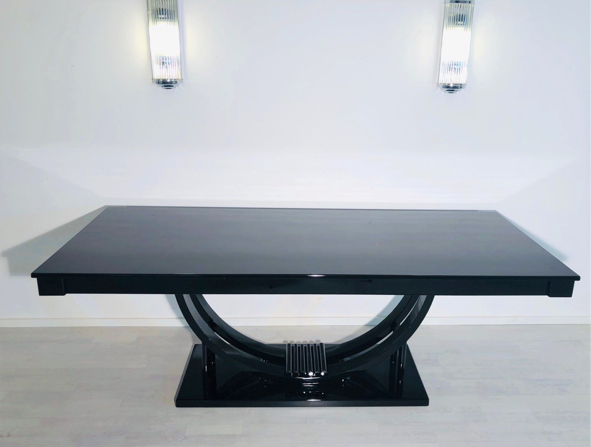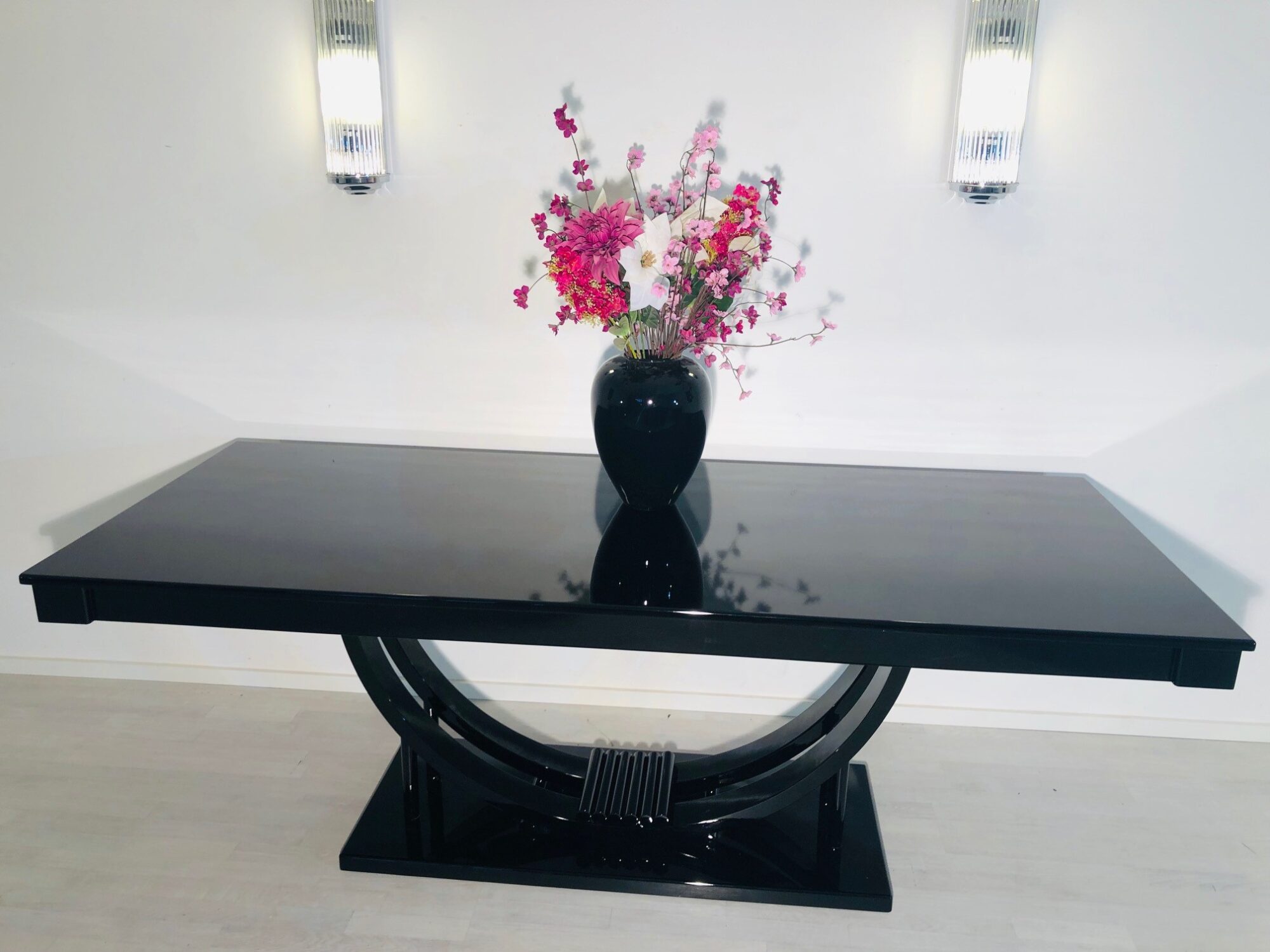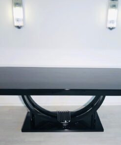 Wundervoller Art Deco Esstisch aus den 1920er Jahren im Adolf Loos Design. Dieser klassische Art Deco Tisch bietet einen wundervoll geschwungen Fuß mit typischen Art Deco Design-Elementen. Das Möbelstück bietet ein hochwertiges Klavierlack-Finish in Hochglanz-Schwarz, welches komplett erneuert wurde, und mit bis zu zehn Schichten aufgetragen und in Handarbeit poliert wurde. Ein High-End Möbelstück perfekt für luxuriöse Wohn- und Esszimmer. Ein elegantes Designstück in Perfektion restauriert. Passende Stühle sind als Nachbau verfügbar, bitte sprechen Sie uns an.