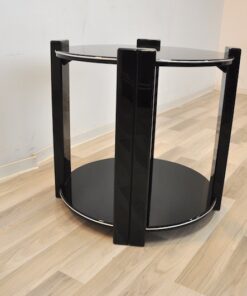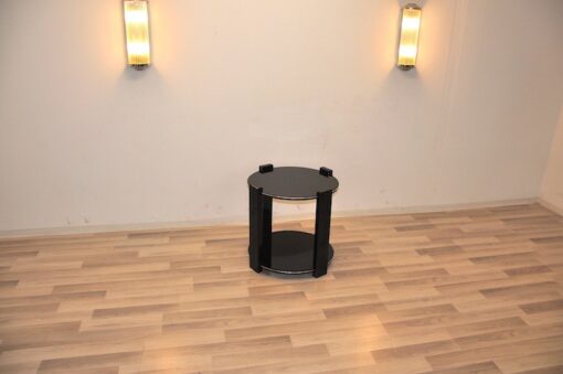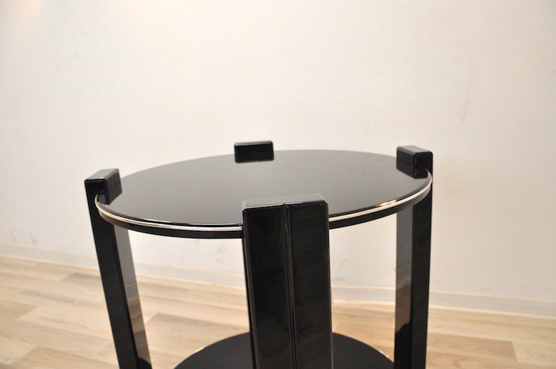 Einmaliger Art Deco Beistelltisch in einem klassischen Design. Eingelegte Platte und handpolierter Klavierlack werden von umlaufenden Chrombändern umgeben.
