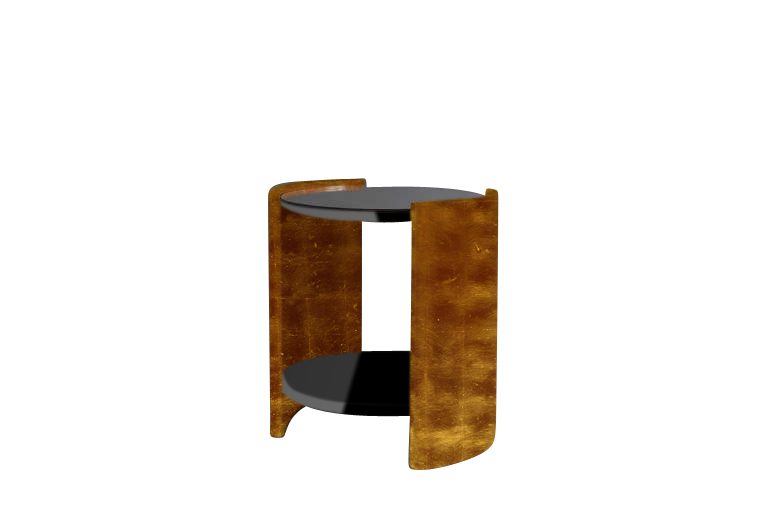 In dem raffinierten Beistelltisch werden warme Goldtöne kunstvoll mit schwarzem Klavierlack kombiniert. Das außergewöhnliche Möbelstück eignet hervorragend zur Ergänzung einer stilvollen Einrichtung.