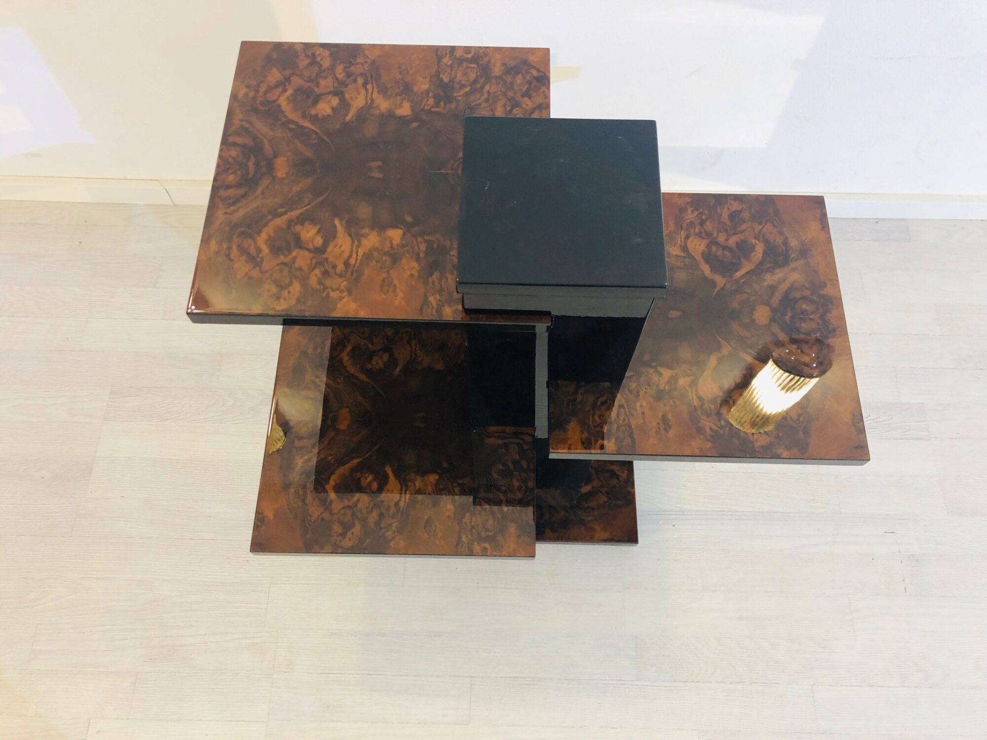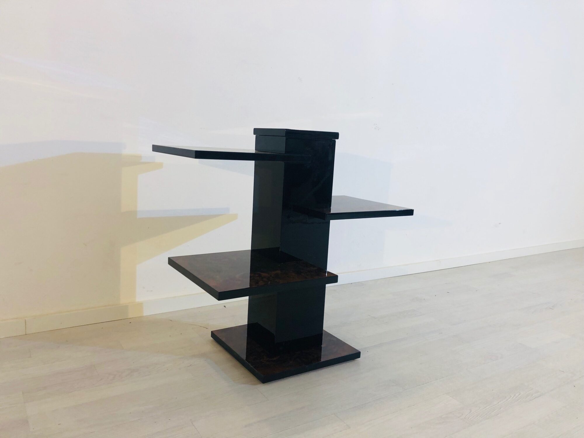 Seltener und einzigartiger Beistelltisch mit einem Säulen-Design mit mehreren Etagen. Die zentrale Säule bietet ein Klavierlack-Finish in Hochglanz-Schwarz, während die drei Etagen des Beistelltisch mit einem wundervollen Walnuss-Wurzelholz furniert sind. Das Wurzelholz bietet eine tolle Farbe und Maserung und pass sehr gut zum rechteckigen Art Deco Design. Die kompakten Maßen machen es möglich, dass der Tisch in kleine Ecken oder einen engen Flur passt. Perfekt um Ihre Sammlerstücke oder Art Deco Stauen auszustellen. Bei Fragen stehen wir gerne zur Verfügung.