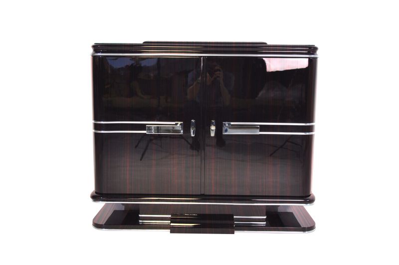 Eine Art Deco Kommode mit Makassarfurnier. Das Design ist mit Chromlinien und großen Chromgriffen versehen, die gepaart mit dem wundervollem Makassarfurnier eine tolle Mischung abgeben. Der standhafte Fuß fügt sich perfekt in das Design ein. Der Innenraum bietet viel Stauraum an in einer tollen gräulichen Farbe. Das Möbelstück befindet sich momentan in der Restauration.