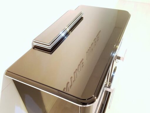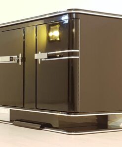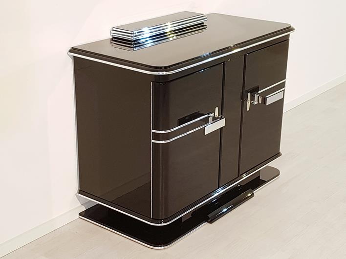 Eine auf Hochglanz polierte Art Deco Kommode. In Klavierlack auf Hochglanz poliert. Es hat ein tolles Innenleben im Jaguar Racing Green mit 4 Schubkästen. Feine Chromlinien und große Chromgriffe prägen das Möbelstück. Das bemerkenswerte Innendesign kommt durch die grünen Schubladen zum Vorschein.