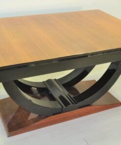 Wundervoller Art Deco Esstisch mit einem Gondel-Fuß und im Palisander Design. Bietet ein klassisches Art Deco Design mit einem geschwungenen Fuß und der tollen Kombination von Klavierlack und palisanderfarbendem Holz. Bietet Platz für 6-8 Personen bei einer Breite von 197cm und 130cm ohne die Erweiterungen. Die Erweiterungen werden angesteckt und müssen separat aufbewahrt werden. Eine elegante Antiquität aus den 1930er Jahren frisch restauriert und in einen tollen Zustand gebracht. Das zentrale Möbelstück für Ihr luxuriöses Wohnzimmer.
