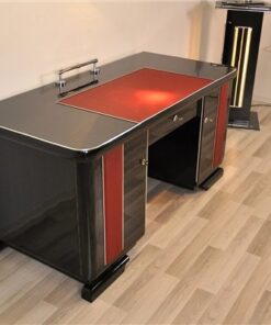 Wundervoller belgischer Art Deco Schreibtisch aus der 2 Hälfte des 20 Jahrhunderts . Mit einzigartigen Chromdetails und roten Lederapplikationen.