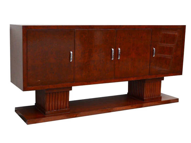 Art Deco Sideboard ist ein absoluter Eyecatcher. Sie ist viertürig und bietet ordentlich Stauraum und zusätzlich eine große Ablagefläche. Die Kommode steht auf zwei sehr stilvollen, säulenartigen Füßen, die auf einer geschlossenen Bodenplatte stehen.