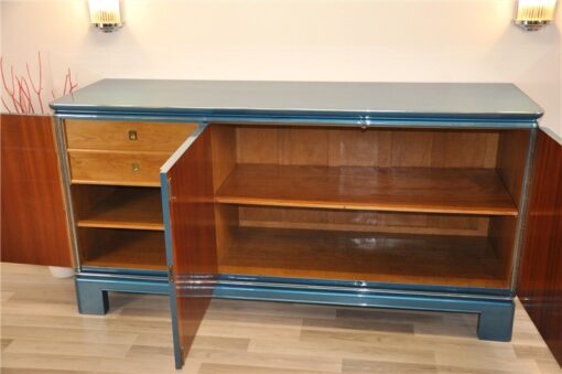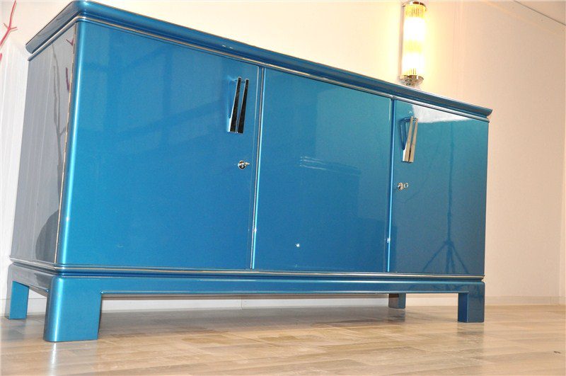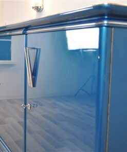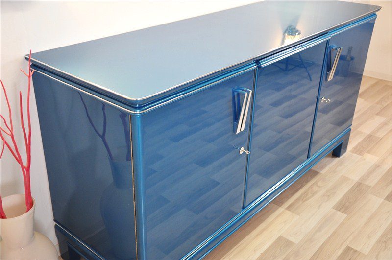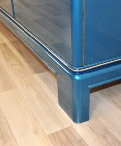 Dieses außergewöhnliche Sideboard besticht durch die einfache Formensprache in Kombination mit einer aufregenden Lackierung. Das Stahlblau Metallic macht es zu einem besonderem Eyecatcher.
