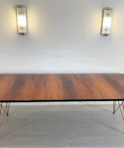 Wundervoller Bauhaus Design Essitsch oder Schreibtisch mit einer 206*109 cm großen Tischplatte aus traumhaften Walnuss-Wurzelholz. Bietet eine elegante Maserung mit einem schönen, warmen Holzton. Mit klassischen Hairpin-Beinen aus Kupfer, und einem polierten Hochglanz-Finish in High-Gloss. Ein echter Hingucker und ein Traummöbel für jedes Wohnzimmer oder Büro. Perfekt restauriert durch unsere Schreinermeister, und in einem hervorragendem Zustnad. Frisch poliert.