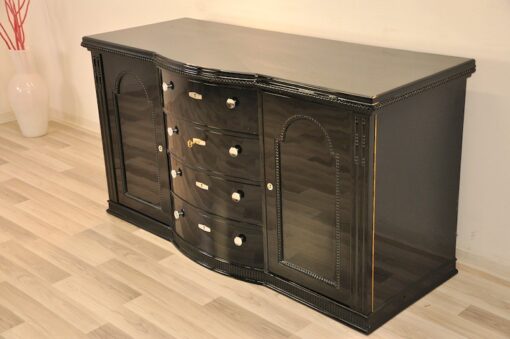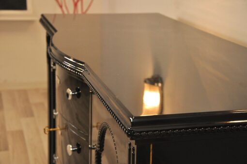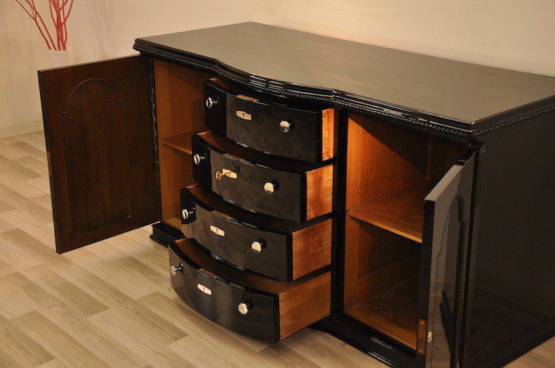 Art Deco Kommode mit wundervollen Ornamenten. Das Stück ist per Hand auf Hochglanz poliert. Es hat Original Schlüssel und typisch abgerundete Schubladen des Art Deco. Tolles Einzelstück!