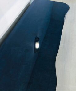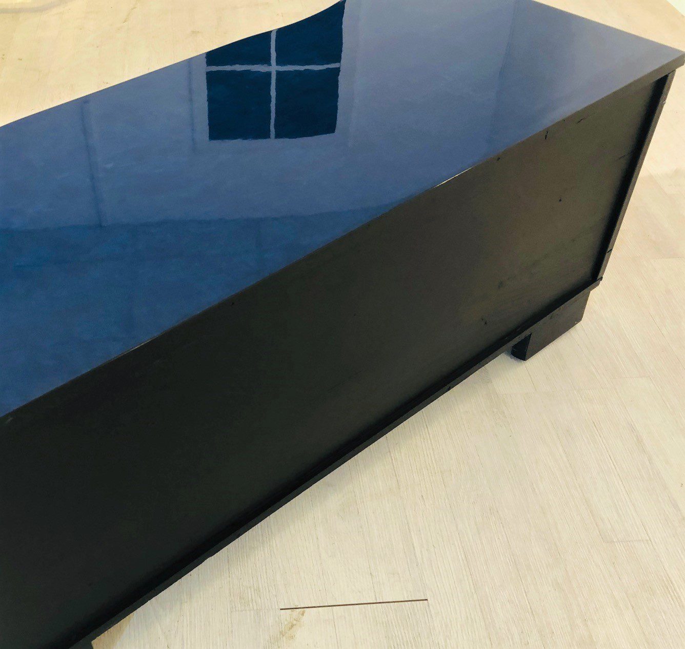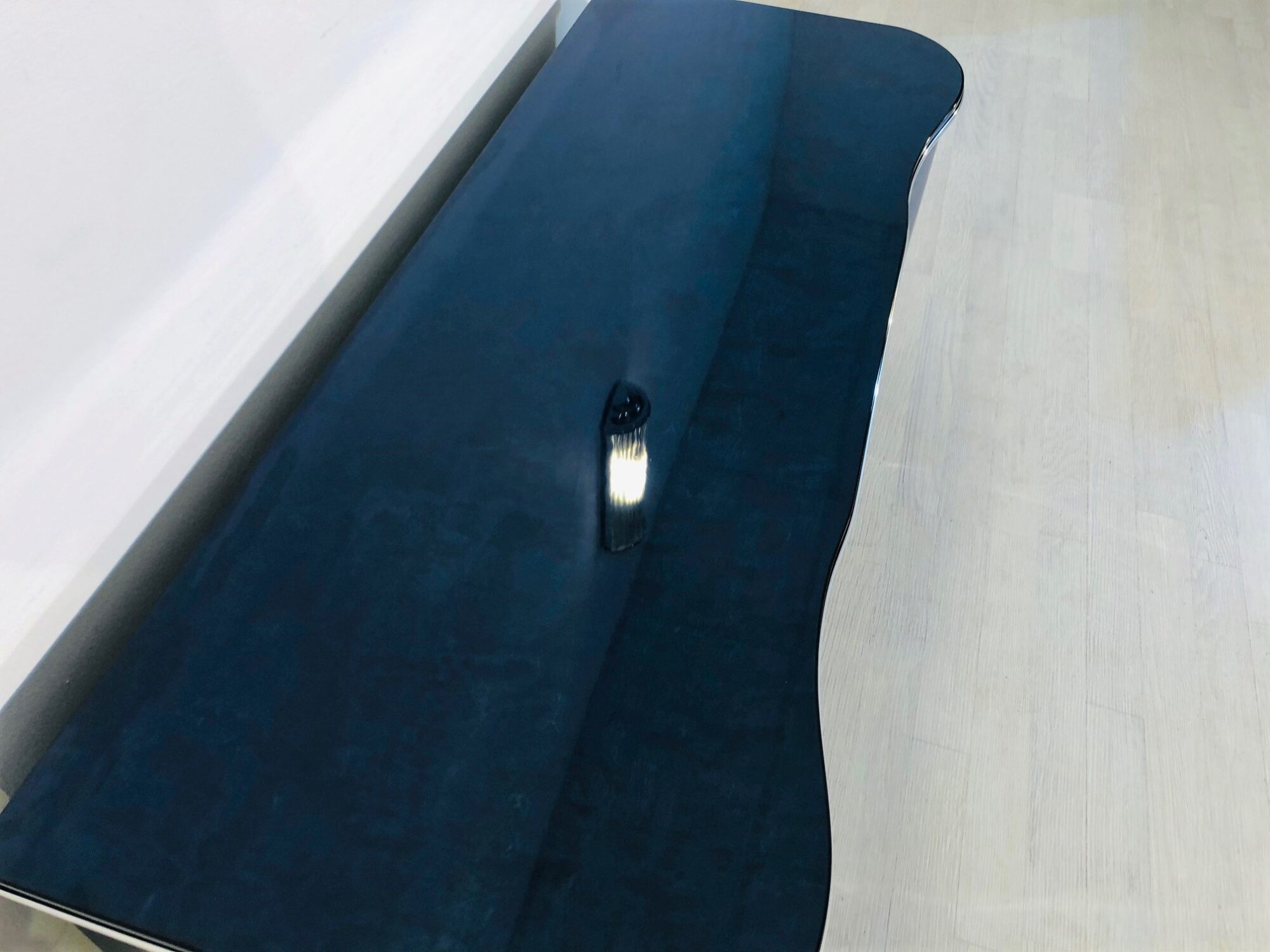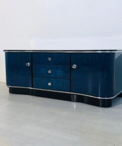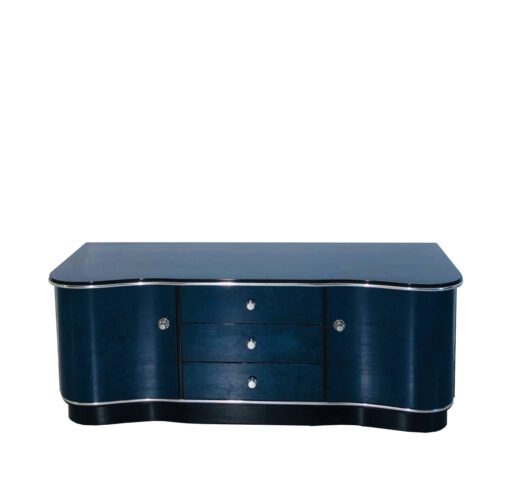 Kleines aber feines Art Deco Lowboard oder Kommode mit einem herrausragenden Navy Blue Finish. Dieses einzigartige Möbelstück bietet ein Hochglanz-Finish mit einem gemusterten Farbton darunter. Im Kontrast dazu ist der Fuß in unserem typischen Klavierlack in Schwarz gehalten. Türen und Korpus sind mit feinen Chrom-Details versehen und auf den geschwungenen Türen und den mittigen Schubladen findet man elegante Chromgriffe. Gerettet aus einem Pariser Hotel und in stundenlanger Handarbeit zur Perfektion restauriert. Originalmöbel aus den 1930ern.