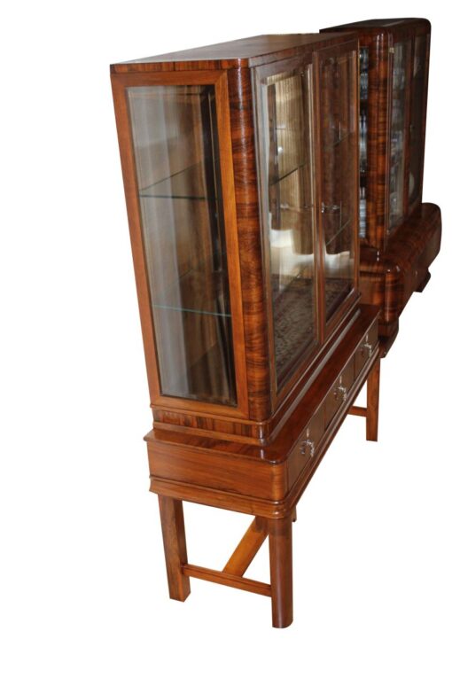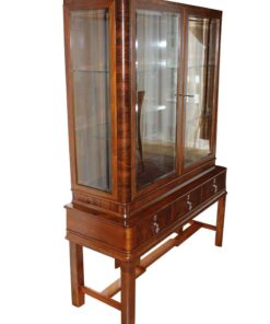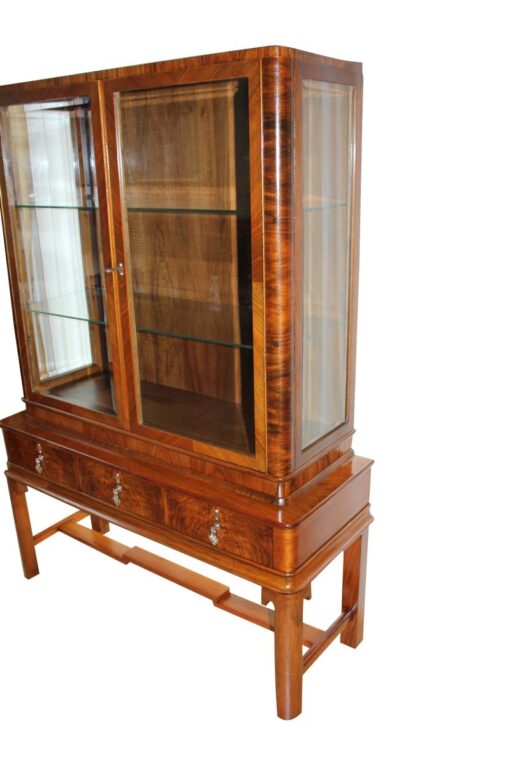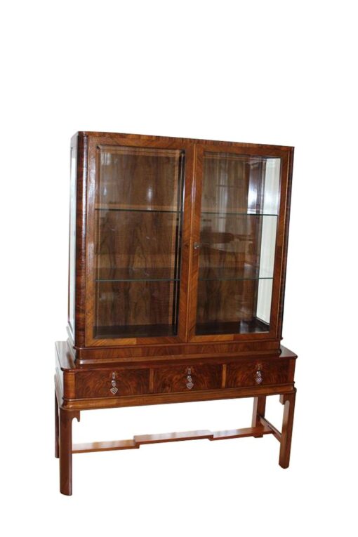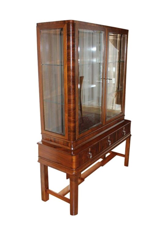 Eine braune Vitrine aus der Zeit des Art Deco. Die obere Hälfte des Möbels besteht aus einer geräumigen Vitrine mit viel Platz zum Ausstellen ihrer Gegenstände, was durch Glastüren ermöglicht wird. Der untere Teil besteht aus drei Schubläden mit vier stabilen Beinen. Das Holz wurde mit Schellack per Handarbeit auf Hochglanz poliert, damit die schöne Maserung und Farbe des Holzes zum Vorschein kommt. Perfekte Vitrine zum Ausstellen oder Aufbewahren von Gegenständen, passt in jedes moderne Wohnzimmer.