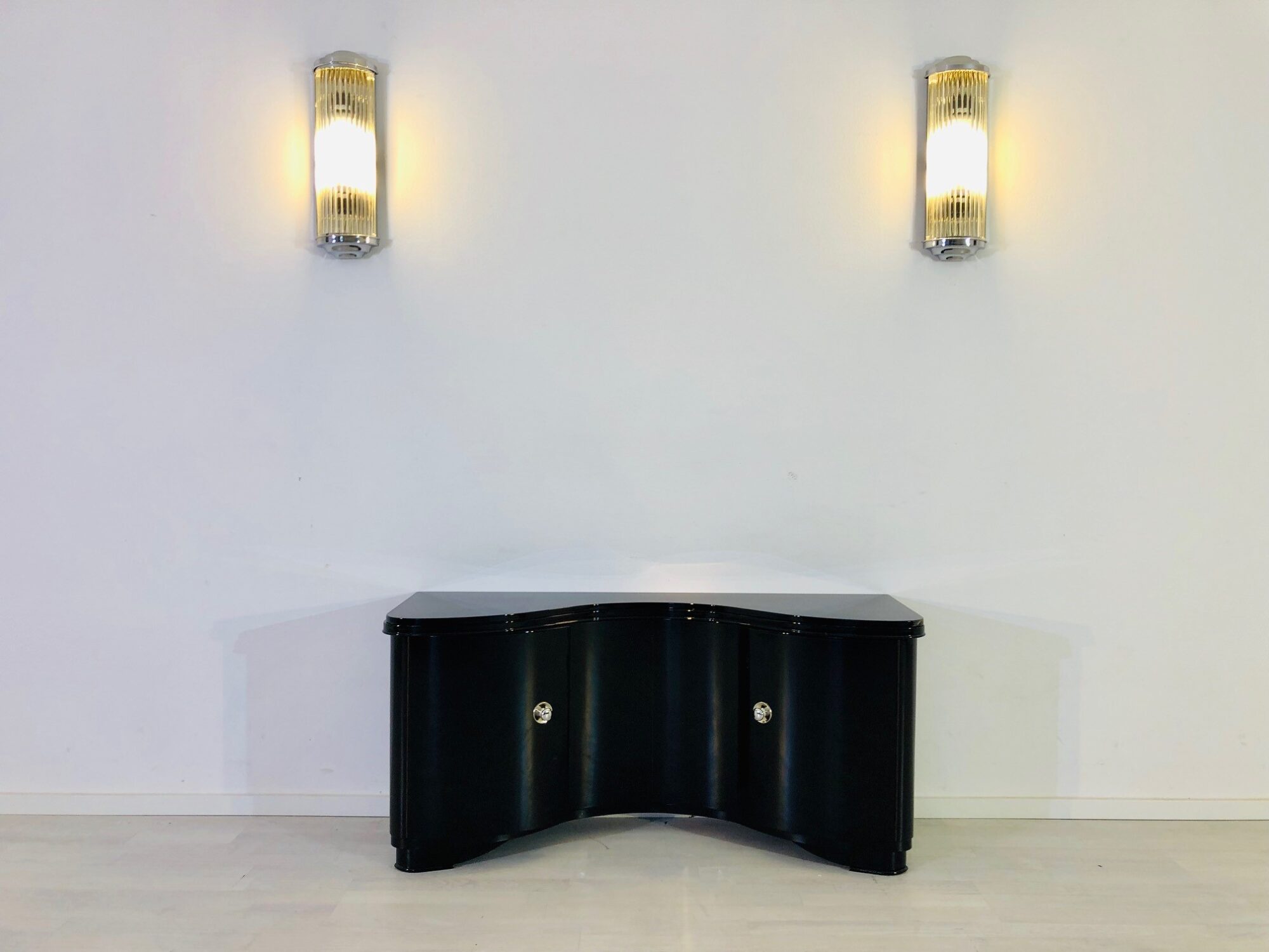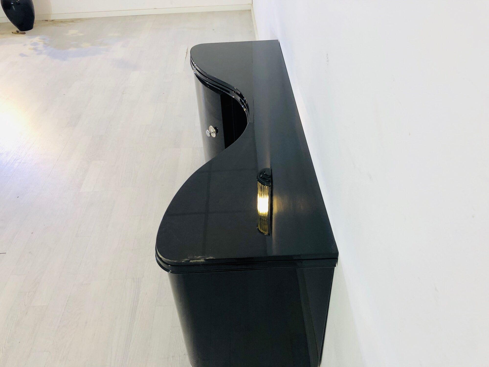 Wundervolle Art Deco Stil Kommode mit einer einzigartig geschwungen Front und einem Serpetinen-Design. Schönes Einzelstück aus Frankreich mit einem neuen, perfekten Hochglanz-Finish. Nutzbar als elegante Bar oder Barschrank mit in die Türen integrierten Regalböden und mit abschliessbaren, drehbaren Mitteltüren. Exklusives und seltenes Möbelstück. Auf den aüßeren Türen befinden sich neue Chromgriffe, während Original Schlösser und Schlüssel vorhanden sind. Gebaut aus Walnussholz in den 1960er Jahren. Luxus-Möbelstück für jeden Art Deco Liebhaber!