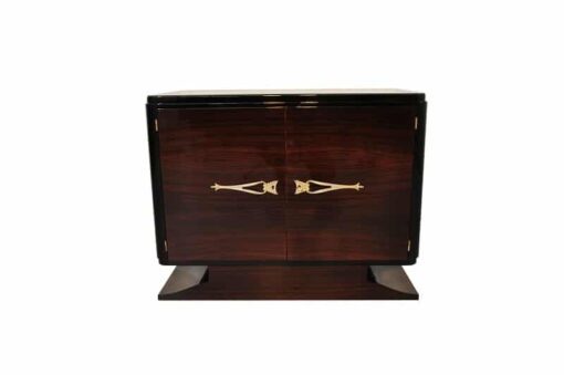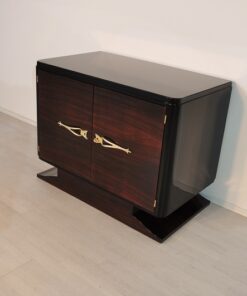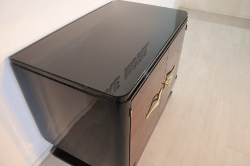 Tolle Makassar Kommode aus dem französischen Art Deco. Die klassische Kombination von edelem Makassarholz mit hochglanzschwarzem Klavierlack macht dieses Einzelstück zu einem echten Hingucker. Ergänzt wird das Design durch wundervolle Messinggriffe.