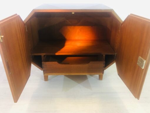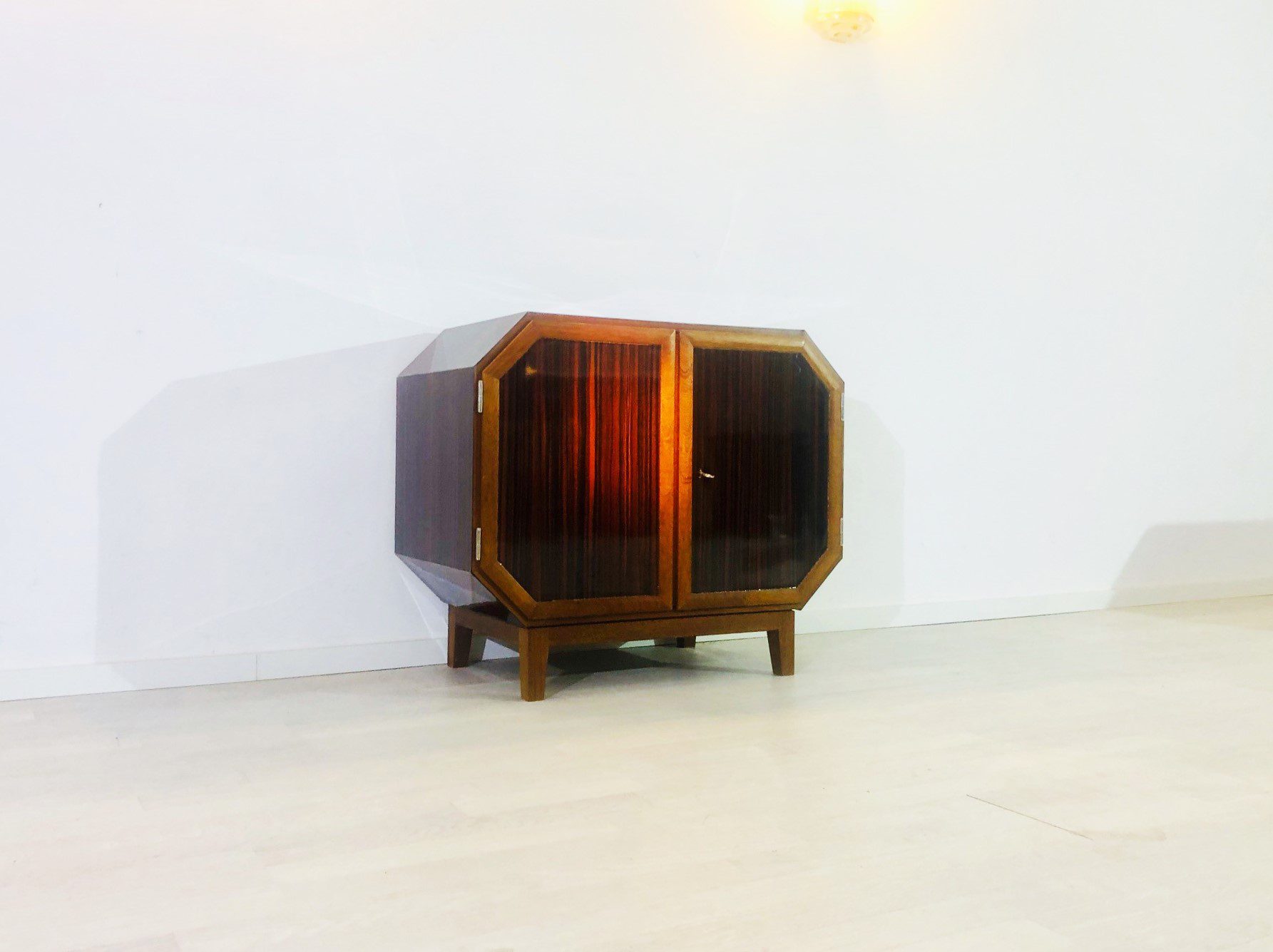 Wundervoller Whiskey Barschrank aus Frankreich, 1930er Jahre. Gebaut aus luxuriösem Makassar- und Mahagoni-Holz überzeugt dieses Meisterstück mit einem oktagonalen Körper sowie einzigartiger Qualität. Das Innenleben ist mit Mahagoni furniert und bietet verschiedenen Staufächer für Flaschen und Gläser, sowie eine kleine Schublade. Auf der Außenseite findet man elegant gemasertes Makassar- und Birnenholz mit einem kontrastreichen Design. Original Art Deco Möbelstück für Ihren Bar- und Cocktailgebrauch. Mit einem hochwertigen, hochglanz Schellack-Finish. Ein außergewöhnliches Stück für Ihr Wohnzimmer.