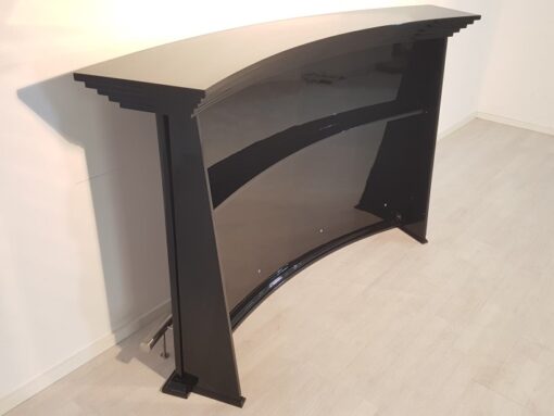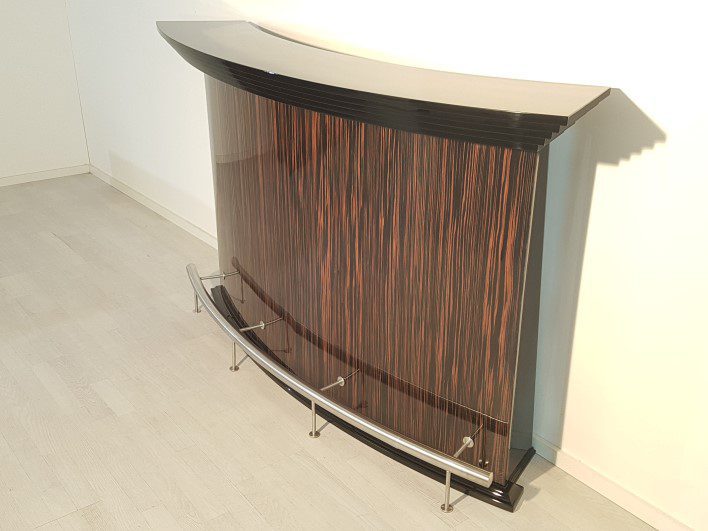 Wundervolle Art Deco Bar mit einer Halbmond-Form. Elegante Bar die auf den Original-Plänen eines französischen Einzelstücks basiert. Hergestellt aus hochwertigen Materialien wie Klavierlack und einem luxuriösem Makassar-Furnier.