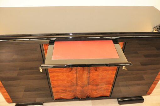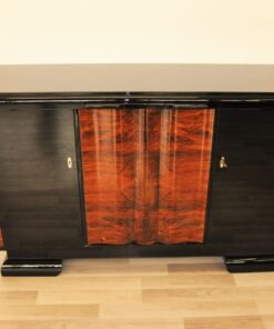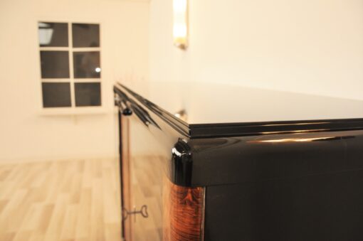 Große Art Deco Kommode mit einer Kombination von hochglänzendem Walnussholz und schwarzem Klavierlack mit einem Mirror-Finish. Wundervolles Design-Möbel das in Handarbeit restauriert wurde.