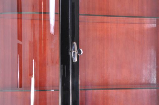 Klassische Art Deco Vitrine bestehend aus einer kleiner Kommode und einem Vitrinen-Schrank mit toll geformten Glastüren. Perfektes luxuriöses Möbelstück zum Ausstellen Ihrer Sammlerstücke. Gebaut in den 1930er Jahren und in Handarbeit restauriert durch unser Schreinerteam. Mit einem neuen Klavierlack-Finish in Hochglanz-Schwarz aufgetragen mit bis zu zehn Schichten. Innenleben mit einem warmtönigen Mahagoni-Furnier und Stauraum auf einem Einlegeboden in der Kommode und mit zwei Glasböden für den Vitrinen-Teil.
