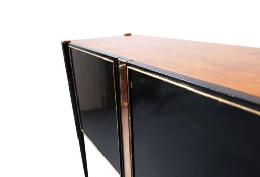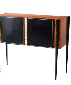 Es besteht aus schwarz lackiertem Holz, Buchen-, sowie Wurzelholz. Die Türen und die Füße sind schwarz lackiert, mit goldenen Umrandungen und Türangeln. In der Mitte der Türen ist ein Spiegel angebracht, welcher das simple Design verziert. Das Wurzelholz, welches den Korpus ausmacht, glänzt in einer schönen braunen Farbe mit tollem Holzmuster.