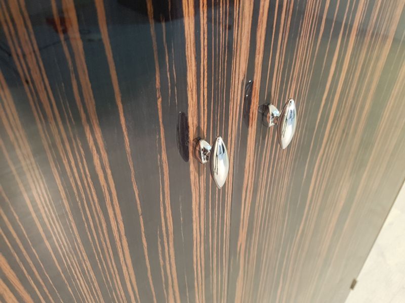 Schmaler Art Deco Schrank mit einem wundervollen Makassar Furnier. Das Design überzeugt mir schlichten Flächen und elegant abgerundeten Ecken. Ein großartiges Möbel im Art Deco Stil.