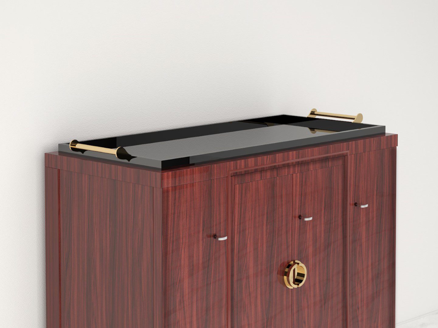 Luxuriöse Art Deco Design Kommode aus fantastischen Palisander-Holz. Das moderne, kubistische Design mit geraden Linien, einem Art Deco Fuß und dem einzigartigen Tablet-Aufsatz überzeugt auf ganzer Linie. Verfeinert mit eleganten, polierten Messingriffen auf den Front-Türen und dekorativen Griffen am Aufsatz. Das Innenleben ist in mattschwarzem Lack gehalten und bietet Stauraum auf zwei verstellbaren Einlegeböden, während die Außenseite mit modernem Palisanderholz furniert wurde.