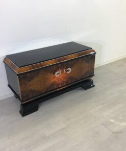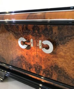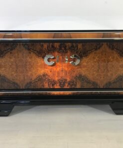 Art Deco Lowboard oder Kommode mit Türen aus wundervollem Walnussholz. Dieses kleine Meisterstück bietet ein tolles Furnier und Details aus Klavierlack. Perfekter, kleiner Stauraum in luxuriösem Design und einer Lacobel-Glasplatte für den täglichen Gebrauch.