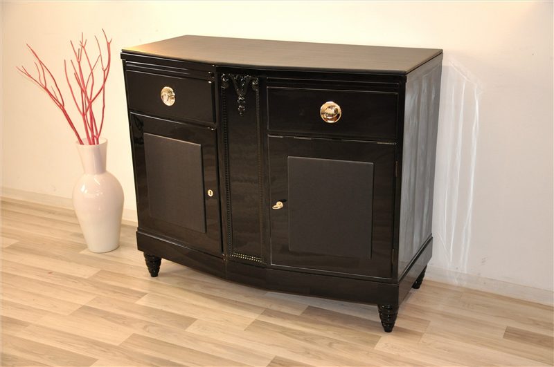 Kleine Art Deco Kommode mit wundervollen Ornamenten. Das Design dieses Möbelsücks zeichnet sich durch die fein geschnitzen Details und die edelen Lederapplikationen aus. In der Topplatte sind zwei lackierte Servier-Auszüge integriert.