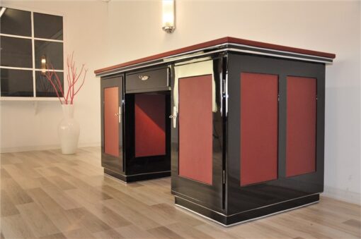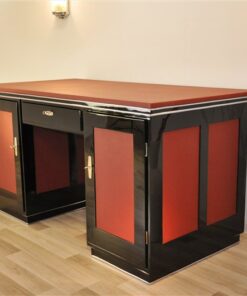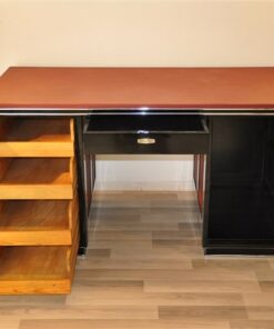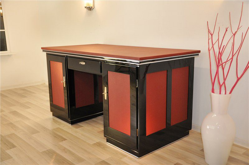 Klassischer Art Deco Schreibtisch aus einer Villa in Lyon. Tischplatte und Apllikationen an den Seitenteilen mit rotem Leder bezogen – ein absoluter Hingucker!