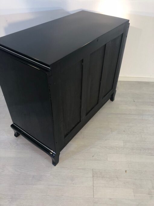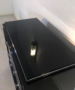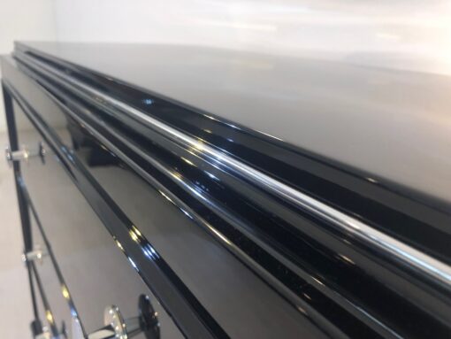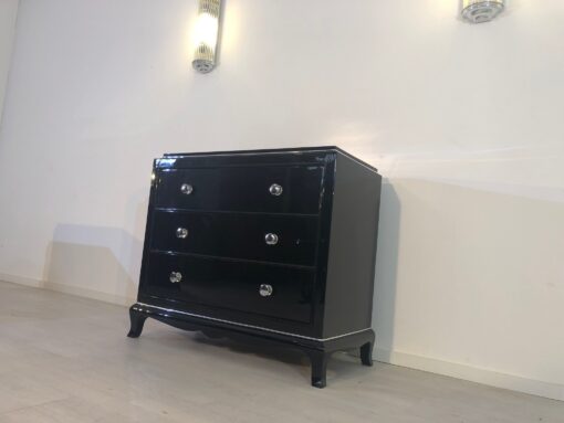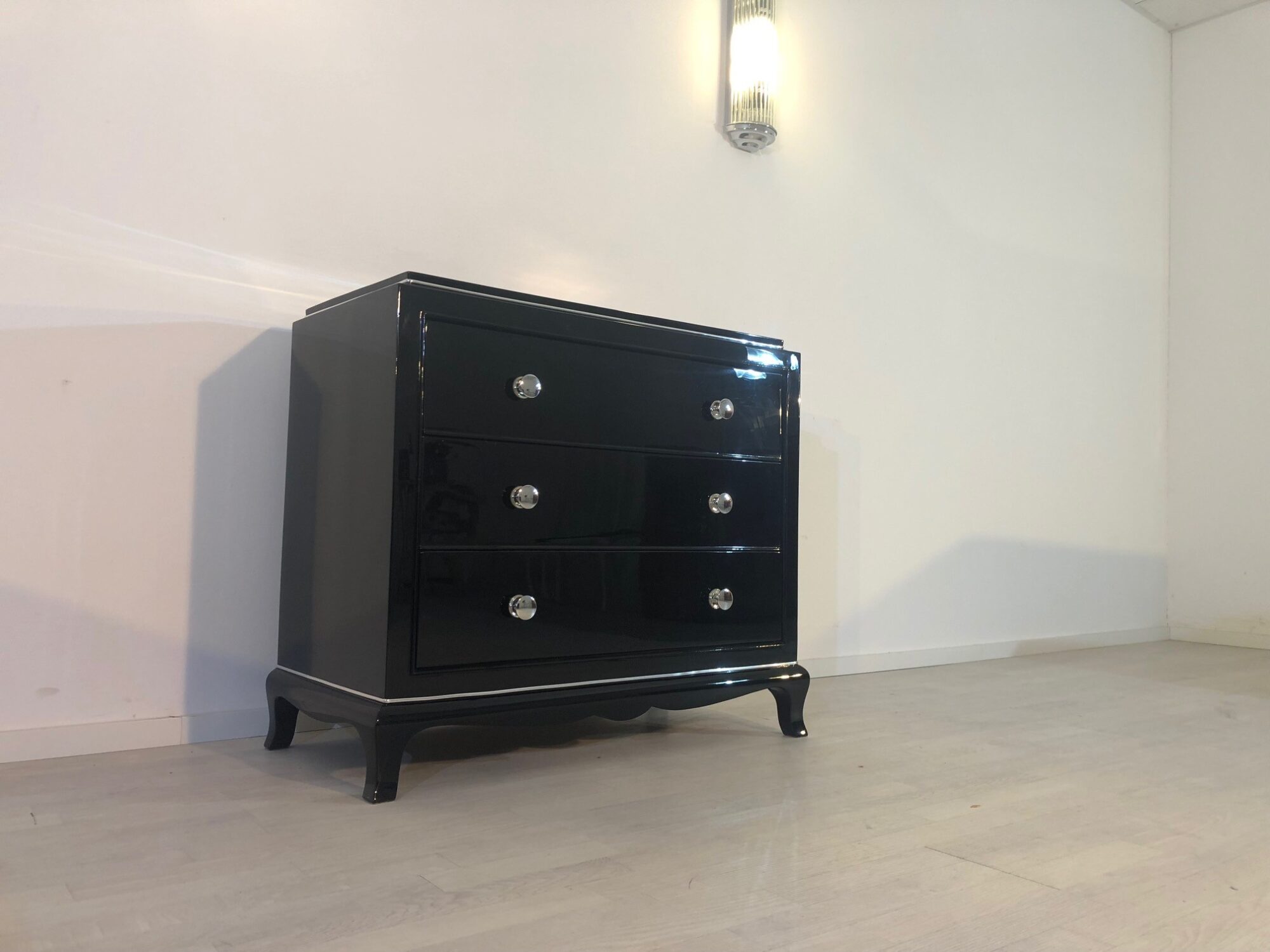 Art Deco Kommode restauriert mit einem tollen Hochglanz-Schwarzen Klavierlack. Dieses Einzelstück bietet ein einzigartiges Design mit geschwungenen Füßen und eleganten Chromakzenten. Luxuriöser Stauraum in drei großen Schubkästen mit verchromten Griffen. Perfekt restaurierter Zustand.