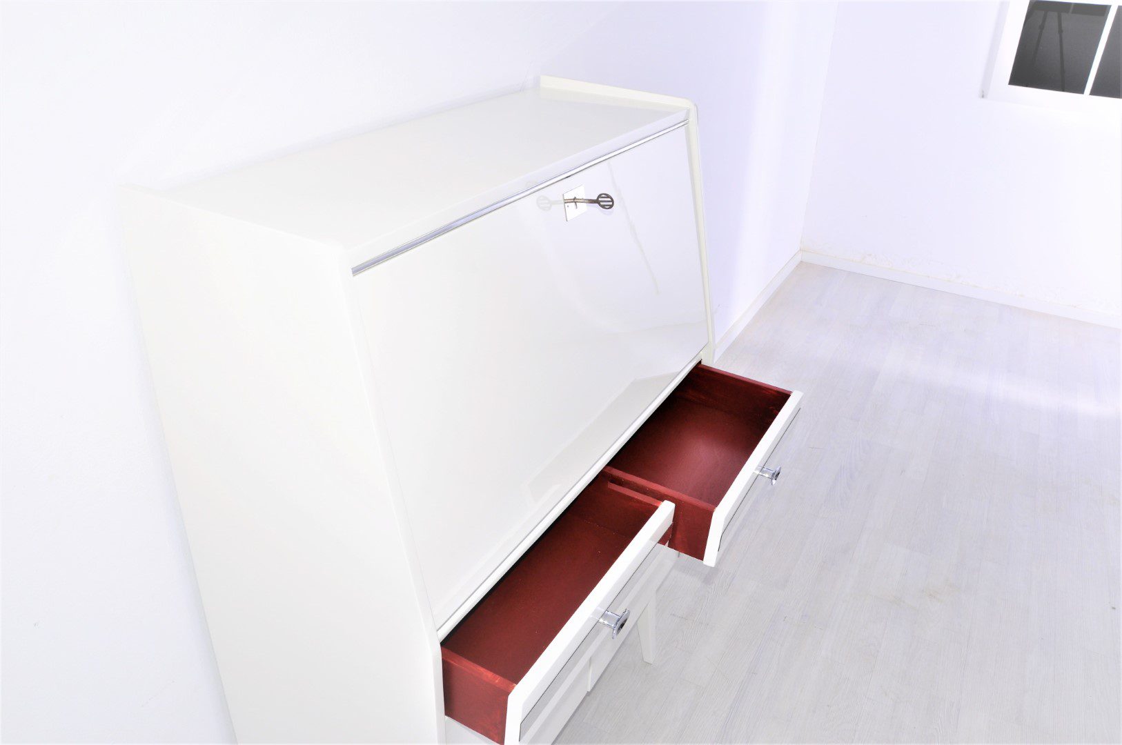 Schöner 50er Jahre Sekretär mit weißer Hochglanzlackierung, Innenleben in Weinrot und weinrotem Leder bezogen. Die 2 Schubkästen und der Korpus mit den beiden Fronten bieten genügend Platz für Ordner und Büroutensilien. Sehr elegantes Möbel das sich mit dem vom Hand poliertem Hochglanzlack perfekt in die Raumsituation einfügen lässt. Ein wundervolles Möbel das in unserer Werkstatt in Handwerklicher Qualität bearbeitet wurde.