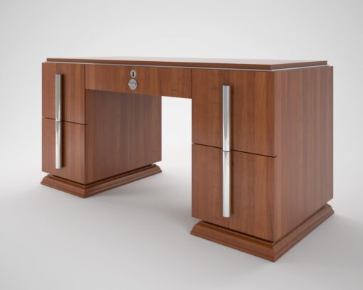 Einfacher aber wunderschöner Walnuss-Schreibtisch mit einem gradlinigen Design und auffallenden Chromgriffen. Bietet luxuriösen Stauraum in vier quadratischen Schubladen und einer kleinen, abschliessbaren Schublade in der Mitte. Ein elegantes Möbelstück aus aufregendem Walnussholz für einen ganz besonderen Raum.