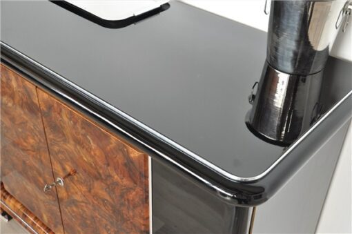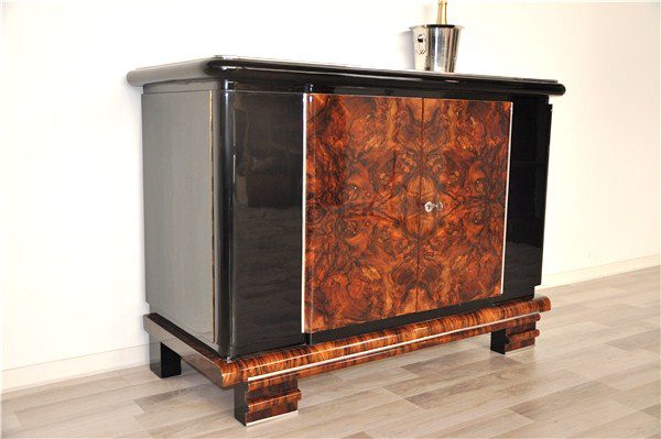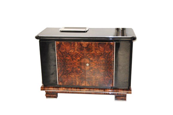 Schöne Art Deco Kommode mit einzigartigem Wurzelholzfurnier. Dieses Einzelstück begeistert mit toll geformten Füßen und mit einem Hochglanz Furnier.